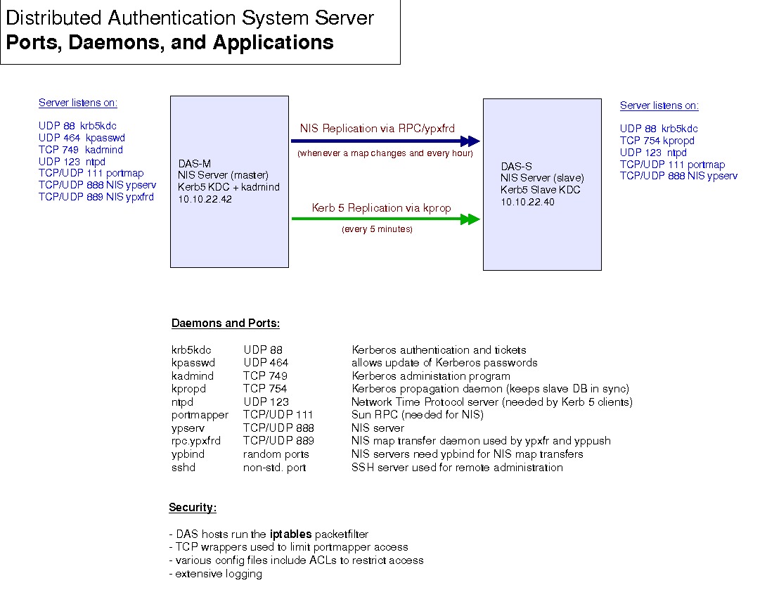 For the purposes of setting up our DAS, we will be configuring two KDCs, a master and a slave. Replication occurs via the kpropd service. This redundancy allows for system maintenance and the occasional failure. Kerberos administrative functions are performed on the master. We are using Red Hat RPM packages to install the Kerb5 software on the DAS servers. This method was chosen in order to keep software patches and upgrades simple, as well as making installation relatively quick.