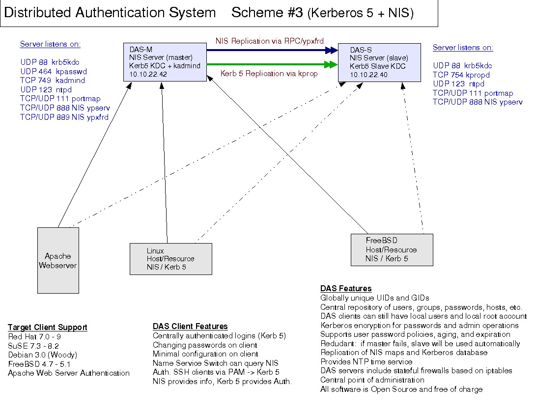 DAS has another NIS-related benefit: if you use NFS in your environment, having NIS already up and running will dramatically simplify things. NFS needs consistent, global UIDs and GIDs in order to work properly. Using the Linux "autofs" automounter to mount DAS user home directories via NFS works just fine. NIS provides naming, Kerberos provides authentication, and NFS/autofs can provide centralized home directories for your DAS users.